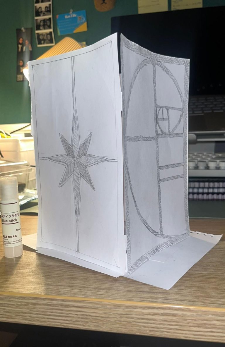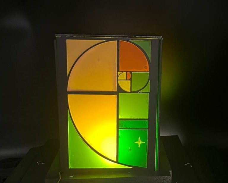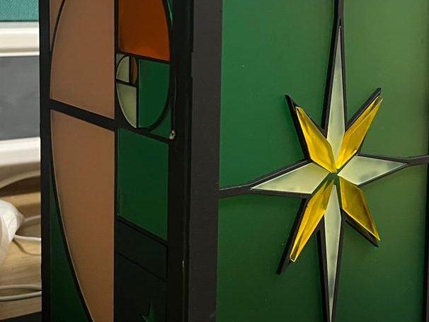 I used acrylic glue to attach the panels upside down together on top of a square acrylic as the top, making sure the star panels faced each other and the Fibonacci spiral panels faced each other. Then once dried, I slid the lampshade into the base.