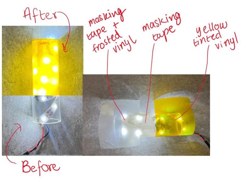 We were given a white LED strip to work with when creating this project, which I placed into a 87.2mm long clear acrylic cylindrical tube. As researched before, we do not like bright white lights. So how do we fix that? We diffuse them and use a colour filter. First, I soldered the light strip with the USB connection to see if it works and how bright it actually is. Then, I used two different materials, Masking tape and Frosted Vinyl, to see how well each diffuses the bright LEDs. They seemed to diffuse the best when aligned on top of each other. I then used a clear yellow tint on top to give a warmer light effect.