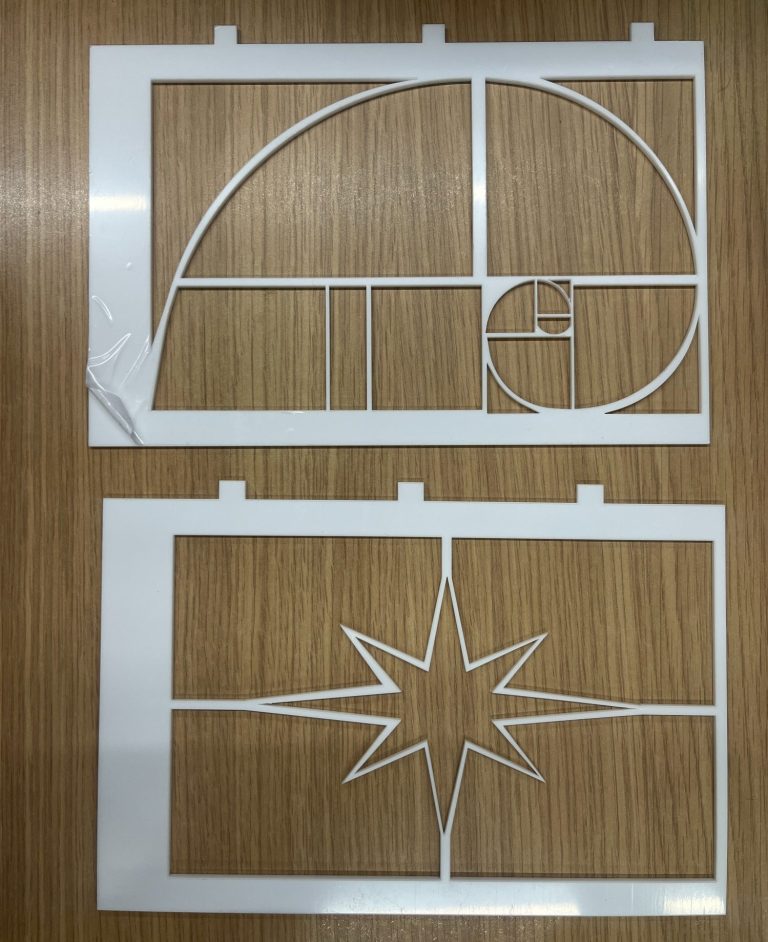 I removed some very small, intricate parts around the smaller curves in the Fibonacci spiral panel, as the lines around them were very thin and caused the acrylic to melt when laser cut.